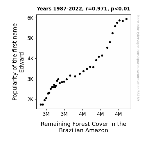 This means 94.2% of the change in the one variable (i.e., Remaining Forest Cover in the Brazilian Amazon) is predictable based on the change in the other (i.e., Popularity of the first name Edward) over the 36 years from 1987 through 2022.