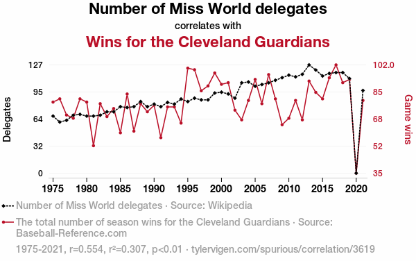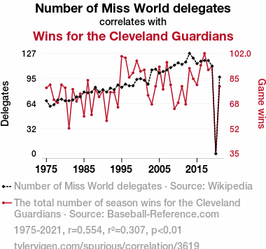 A linear line chart with years as the X-axis and two variables on the Y-axis. The first variable is Number of Miss World delegates and the second variable is Wins for the Cleveland Guardians.  The chart goes from 1975 to 2021, and the two variables track closely in value over that time. Small Image