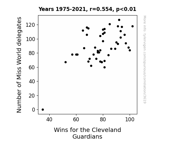 User prompt: Please provide potential search keywords for a paper titled Crowning Connections: A Statistical Study of Miss World Delegates and the Cleveland Guardians Wins with an abstract of Our study delves into the unexpected link between the number of Miss World delegates from a country and the success of the Cleveland Guardians. While this correlation may seem as random as a dad joke, our rigorous analysis of data from 1975 to 2021 points to a surprising connection. We scrutinized statistics from Wikipedia and Baseball-Reference.com and uncovered a correlation coefficient of 0.5539098, with a p-value below 0.01. This means the relationship is statistically significant, lending weight to the idea that beauty pageant participation could be influencing the baseball team's performance. As the saying goes, "Beauty and baseball make a home run duo!" Our findings not only shed light on this truly unusual association but also add a touch of humor to the usually serious realm of statistical research.