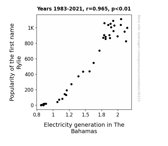 This means 93.2% of the change in the one variable (i.e., Electricity generation in The Bahamas) is predictable based on the change in the other (i.e., Popularity of the first name Rylie) over the 39 years from 1983 through 2021.