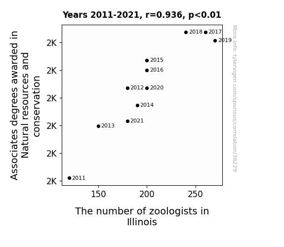 This means 87.6% of the change in the one variable (i.e., The number of zoologists in Illinois) is predictable based on the change in the other (i.e., Associates degrees awarded in Natural resources and conservation) over the 11 years from 2011 through 2021.
