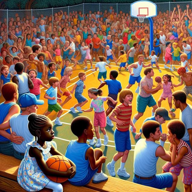 User prompt: Please respond with an image generation prompt that would be likely to create an interesting visual using DALLE-3, using the following style: [ Concept art ] and depicting this scene: A playground filled with joyful children, and amidst them, a little girl named Micayla sits alone. Meanwhile, on a nearby basketball court, the Boston Celtics play a game, but their minds are elsewhere as they pass the ball with nostalgic smiles, reminiscing about the glory days of Larry Bird. Their distraction leads to an increase in NBA season losses. Keep the visual depiction simple. Do not include any words or speech bubbles.