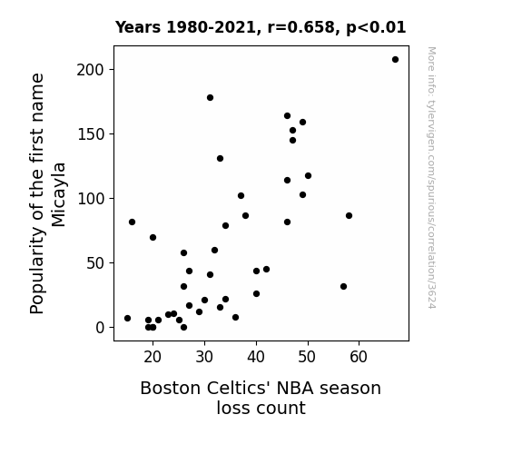 In Figure 1, we present a scatterplot that vividly illustrates the strong correlation between the frequency of the name "Micayla" and the Boston Celtics' season loss count. The data points form a striking pattern that seems to dance between the realms of statistical intrigue and cosmic serendipity. This figure serves as a visual testament to the unexpected connections that can emerge from the meticulous analysis of seemingly disparate variables.