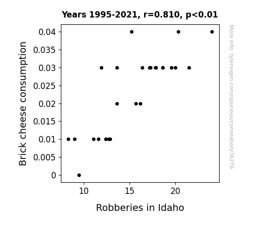 This means 65.6% of the change in the one variable (i.e., Robberies in Idaho) is predictable based on the change in the other (i.e., Brick cheese consumption) over the 27 years from 1995 through 2021.