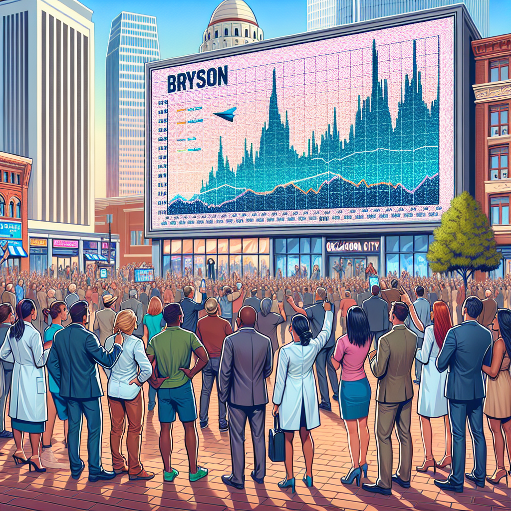 Prompt: Prompt: Generate an image of a vibrant downtown square in Oklahoma City, where a large digital screen displays a graph showcasing the popularity of the first name Bryson. In the foreground, crowds of people gather around the screen, pointing and engaging in lively conversations. Closer to the screen, a group of bustling statisticians wearing lab coats and glasses analyze the data on the graph with great enthusiasm. Capture the simultaneous rise in the popularity of the name Bryson and the surge in statistical analysis, depicting the bustling city scene with dynamic movement and energy. The depiction should include only scenes, people, and objects, it should not include text or speech bubbles.