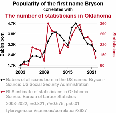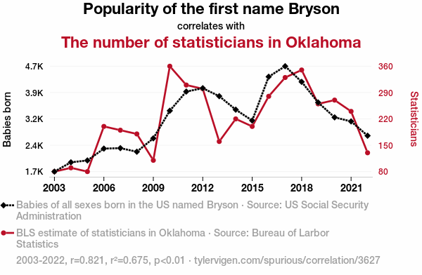 User prompt: Please provide potential search keywords for a paper titled Bryson Dynasty and Statisticians in Oklahoma: A Surprising Symphony? with an abstract of This study delves into the intriguing puzzle of the potential relationship between the rising popularity of the first name Bryson and the number of statisticians in the plains of Oklahoma. Leveraging data from the US Social Security Administration and the Bureau of Labor Statistics spanning from 2003 to 2022, our research team conducted an in-depth statistical analysis to untangle this enigmatic, and some might say whimsical, connection.
