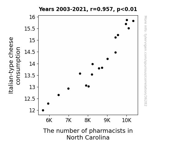 This means 91.5% of the change in the one variable (i.e., The number of pharmacists in North Carolina) is predictable based on the change in the other (i.e., Italian-type cheese consumption) over the 19 years from 2003 through 2021.