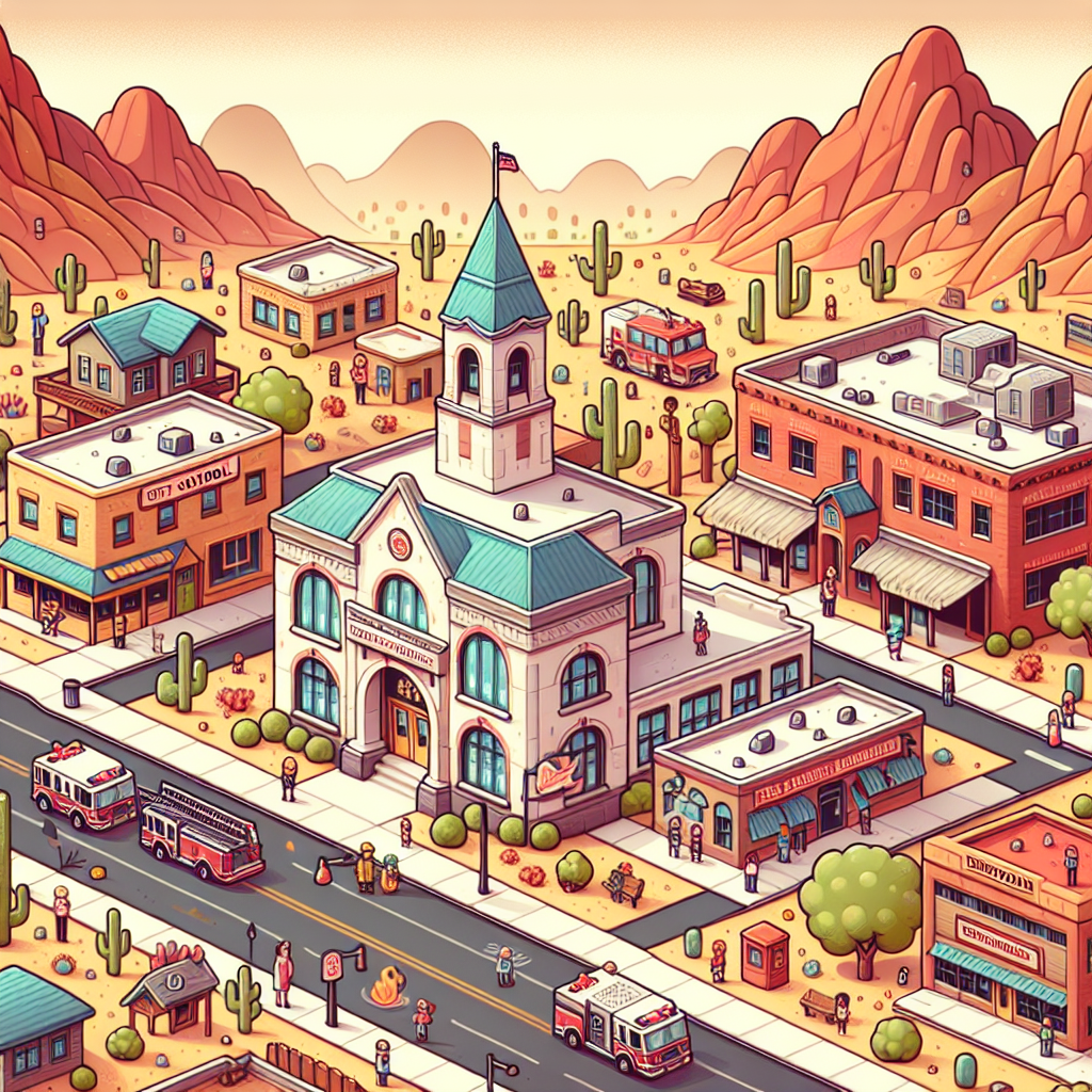 Prompt: [ Cutesy art illustration ] Create an adorable illustration depicting a desert town in Arizona, with a cheerful school and a charming fire department building. A colorful chalkboard sign outside the school showcases the declining popularity of the first name Antwan each year. Beside it, the fire department proudly displays a chart indicating a decrease in arson incidents. Show the community living happily and working together to make their town safer in a heartwarming and whimsical style. The depiction should include only scenes, people, and objects, it should not include text or speech bubbles.
