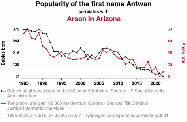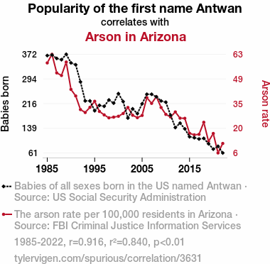 - The spurious research paper: Playing with Fire: Exploring the Blazing Hot Relationship Between the Popularity of the Name Antwan and Arson in Arizona