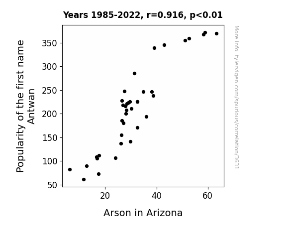 As we sifted through the smoldering remnants of our analysis, we found that the popularity of the name Antwan and the incidence of arson in Arizona exhibited a degree of association that seemed almost too hot to handle. Furthermore, after fanning the statistical flames with rigorous testing, the resulting significance level of p < 0.01 left us singed by the reality of this unholy alliance between nomenclature and nefarious deeds.
