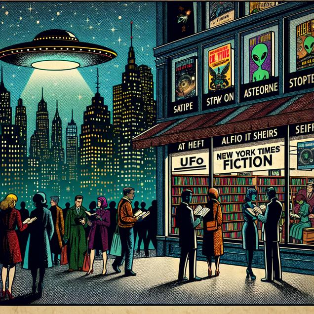 ChatGPT: In a bookstore window display, the latest New York Times Fiction Best Sellers are prominently featured, with a section dedicated to sci-fi novels filled with stories of alien encounters and UFO sightings. A crowd of people are gathered around, each holding a book and discussing the recent surge in interest in extraterrestrial fiction. Meanwhile, in the night sky above, a glowing UFO hovers over the city, its presence a testament to the growing intrigue in the unknown.