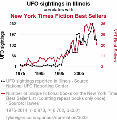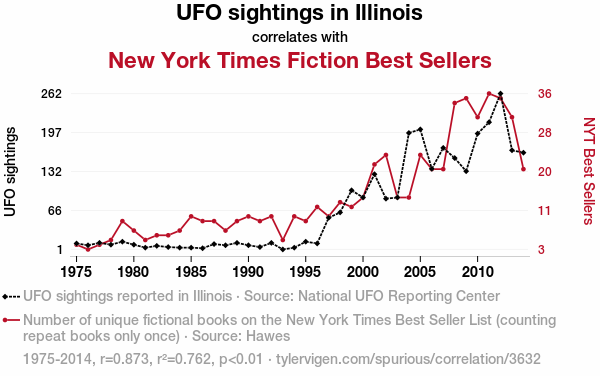 A linear line chart with years as the X-axis and two variables on the Y-axis. The first variable is UFO sightings in Illinois and the second variable is New York Times Fiction Best Sellers.  The chart goes from 1975 to 2014, and the two variables track closely in value over that time. Small Image