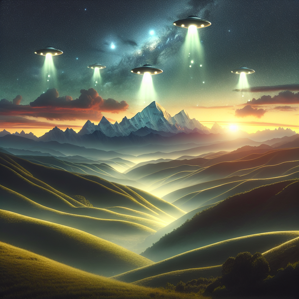 User prompt: Please respond with an image generation prompt that would be likely to create an interesting visual using DALLE-3, using the following style: [ Futuristic ] and depicting this scene: Amidst the rolling hills of Kentucky, bright lights from UFOs illuminate the night sky as alien tourists descend to the earth. In the distance, the majestic Mount Everest stands tall, with a line of successful climbers waving triumphantly from the snowy summit. The newfound interest from the alien tourists has brought an unusual surge in successful climbs, with the UFOs hovering in the background, observing the conquering of Earth's tallest peak. Keep the visual depiction simple. Do not include any words or speech bubbles.