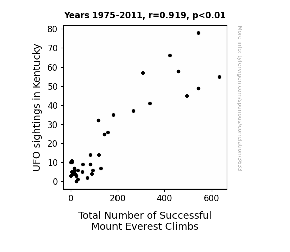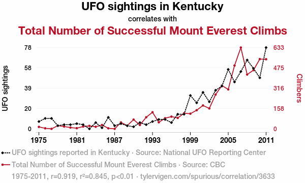 User prompt: Please provide potential search keywords for a paper titled Curse or Verse: Rehearse Reverses in Kentucky UFO Sightings and Total Everest Climbs with an abstract of This research paper presents an investigation into the connection between UFO sightings in the state of Kentucky and the total number of successful Mount Everest climbs. Using data sourced from the National UFO Reporting Center and the CBC archives, our research team pored over records spanning the years 1975 to 2011. Employing rigorous statistical analyses, we discovered a surprisingly high correlation coefficient of 0.9193995 and a p-value of less than 0.01, indicating a strong relationship between these seemingly disparate phenomena. The findings of this study underscore the tantalizing interplay between unexplained aerial phenomena in the bluegrass state and the triumphs of humankind atop the world's highest peak.