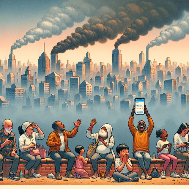 ChatGPT: Generate an image of a cartoon-style city skyline, partially obscured by a thick, brown smog. In the foreground, depict a few people sitting outdoors, struggling to breathe and looking visibly weary. As the air quality improves, show the haze dissipating to reveal a clear, vibrant blue sky. People should be shown with smiles on their faces, lifting their heads and taking deep breaths of the fresh air. In the background, include a group of them gathered around a smartphone, excitedly typing "Snoop Dog" into the search bar.