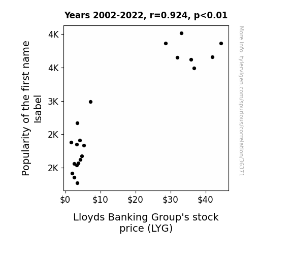 This means 85.4% of the change in the one variable (i.e., Lloyds Banking Group's stock price (LYG)) is predictable based on the change in the other (i.e., Popularity of the first name Isabel) over the 21 years from 2002 through 2022.