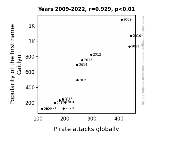 A linear line chart with years as the X-axis and two variables on the Y-axis. The first variable is Popularity of the first name Caitlyn and the second variable is Pirate attacks globally.  The chart goes from 2009 to 2022, and the two variables track closely in value over that time. Small Image