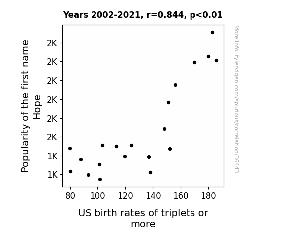 This means 71.2% of the change in the one variable (i.e., US birth rates of triplets or more) is predictable based on the change in the other (i.e., Popularity of the first name Hope) over the 20 years from 2002 through 2021.