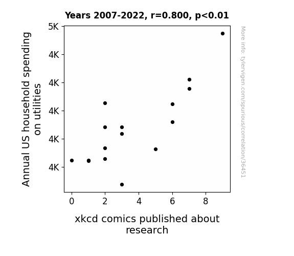 This means 64% of the change in the one variable (i.e., xkcd comics published about research) is predictable based on the change in the other (i.e., Annual US household spending on utilities) over the 16 years from 2007 through 2022.