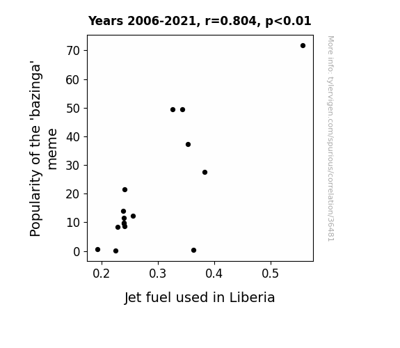 This means 64.7% of the change in the one variable (i.e., Jet fuel used in Liberia) is predictable based on the change in the other (i.e., Popularity of the 'bazinga' meme) over the 16 years from 2006 through 2021.