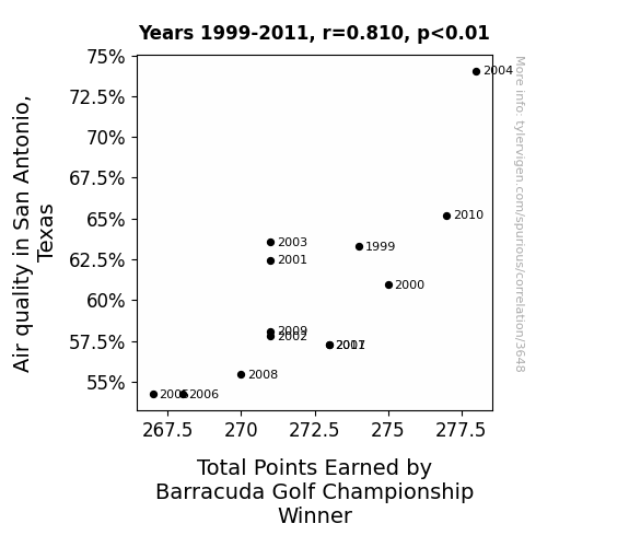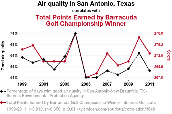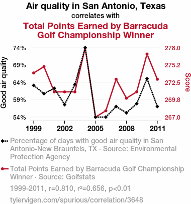 - The spurious research paper: Swinging Through the Air: A Breath of Fresh Fairway - The Correlation Between Air Quality in San Antonio, Texas and Total Points Earned by Barracuda Golf Championship Winner