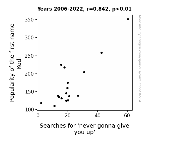 This means 70.9% of the change in the one variable (i.e., Searches for 'never gonna give you up') is predictable based on the change in the other (i.e., Popularity of the first name Kodi) over the 17 years from 2006 through 2022.