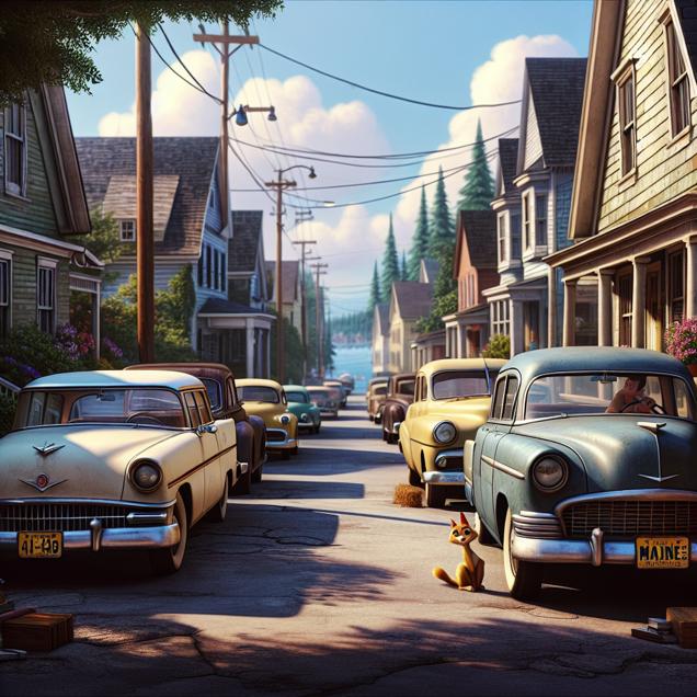 ChatGPT: Create an image that resembles a scene from a Disney movie where a serene, picturesque street in Maine is depicted. Show a row of parked cars adorned with charming details, suggesting a quiet and peaceful neighborhood. One of the cars should prominently display a license plate with the name "Justin," emphasizing the theme of fading popularity. The overall atmosphere should convey a sense of nostalgia and tranquility, reminiscent of a classic Disney setting.