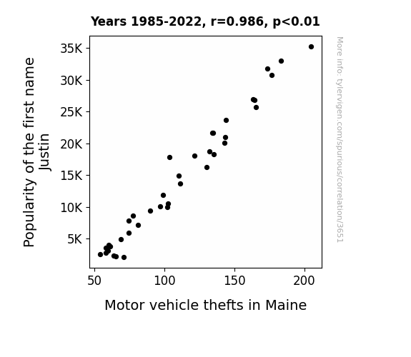 As depicted in the scatterplot (Fig. 1), the relationship between the popularity of the name "Justin" and motor vehicle thefts in Maine is strikingly linear, with a clear upward trend that leaves little room for doubt. The correlation is so pronounced that one might be tempted to coin a new term: "auto-Justin theft" to encapsulate this peculiar phenomenon.