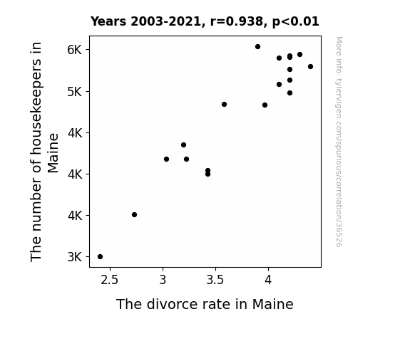 This means 88% of the change in the one variable (i.e., The divorce rate in Maine) is predictable based on the change in the other (i.e., The number of housekeepers in Maine) over the 19 years from 2003 through 2021.