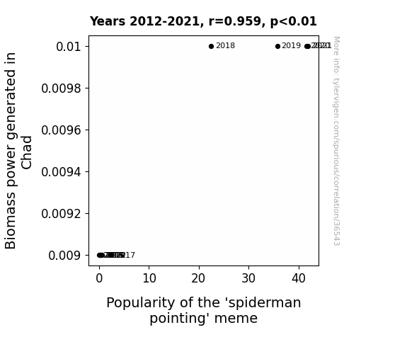 This means 92% of the change in the one variable (i.e., Popularity of the 'spiderman pointing' meme) is predictable based on the change in the other (i.e., Biomass power generated in Chad) over the 10 years from 2012 through 2021.