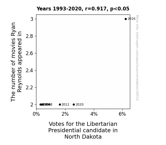 This means 84% of the change in the one variable (i.e., Votes for the Libertarian Presidential candidate in North Dakota) is predictable based on the change in the other (i.e., The number of movies Ryan Reynolds appeared in) over the 6 years from 1993 through 2020.