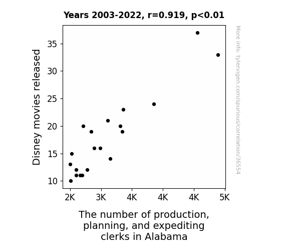 This means 84.5% of the change in the one variable (i.e., The number of production, planning, and expediting clerks in Alabama) is predictable based on the change in the other (i.e., Disney movies released) over the 20 years from 2003 through 2022.