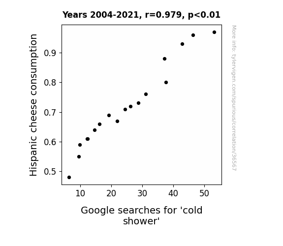 This means 95.8% of the change in the one variable (i.e., Google searches for 'cold shower') is predictable based on the change in the other (i.e., Hispanic cheese consumption) over the 18 years from 2004 through 2021.