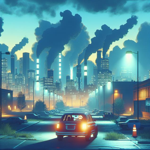 ChatGPT: Prompt: Create a photorealistic image of a deserted parking lot in a bustling neighborhood in Youngstown, Ohio. The scene is characterized by thick pollution from nearby factories, but amidst the haze, a stolen car is illuminated by streetlights. The "Check Engine" light on the car blinks, standing out as a glimmer of hope. The increased visibility due to cleaner air has led to a decrease in motor vehicle thefts across Ohio.