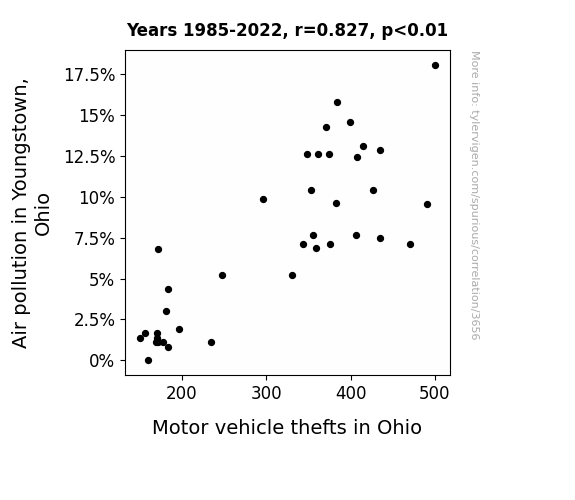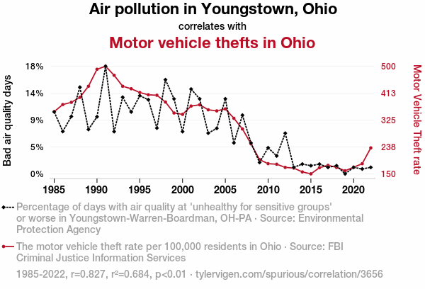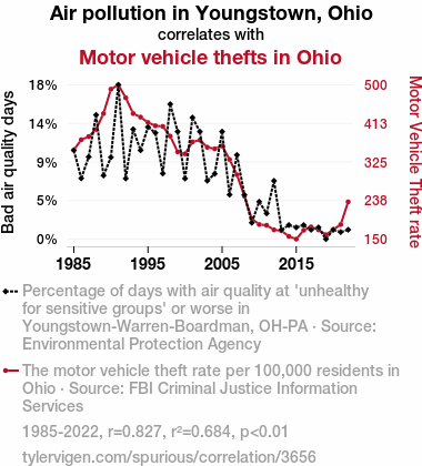 This means 68.4% of the change in the one variable (i.e., Motor vehicle thefts in Ohio) is predictable based on the change in the other (i.e., Air pollution in Youngstown, Ohio) over the 38 years from 1985 through 2022.