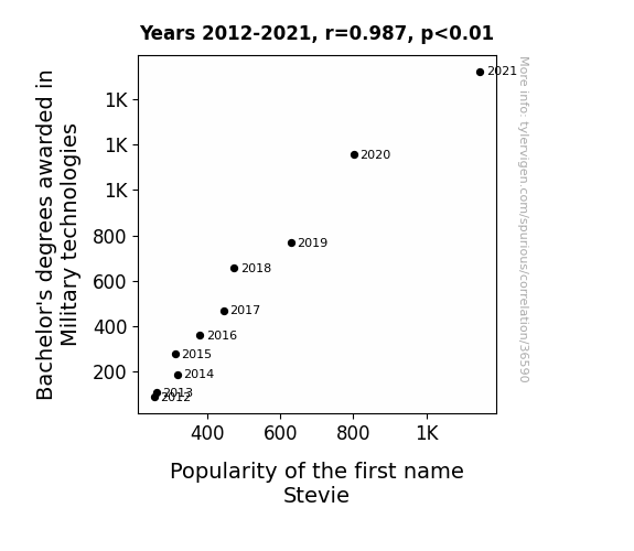 This means 97.3% of the change in the one variable (i.e., Popularity of the first name Stevie) is predictable based on the change in the other (i.e., Bachelor's degrees awarded in Military technologies) over the 10 years from 2012 through 2021.