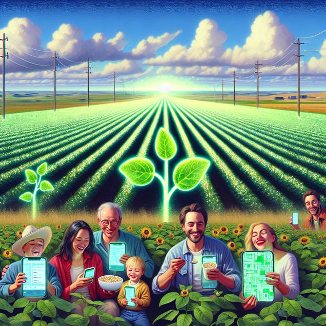 Prompt: The fields of North Dakota are lined with endless rows of vibrant, genetically modified soybean plants. The soybeans, referred to as "Soyboys," are depicted as futuristic, pixelated crops emitting a subtle glow amidst the verdant landscape. In the foreground, contented North Dakotans are enjoying their Apple products, seamlessly integrated into the scene. A sense of technological harmony permeates the image, with the soybean plants and Apple devices symbolizing a high-tech coexistence, radiating a soothing, futuristic ambiance. The depiction should include only scenes, people, and objects, it should not include text or speech bubbles.