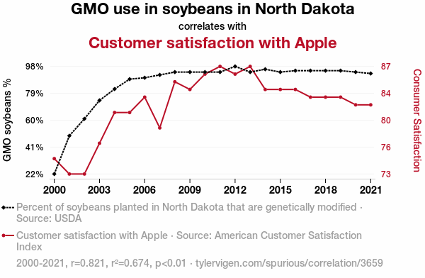 This means 67.4% of the change in the one variable (i.e., Customer satisfaction with Apple) is predictable based on the change in the other (i.e., GMO use in soybeans in North Dakota) over the 22 years from 2000 through 2021.
