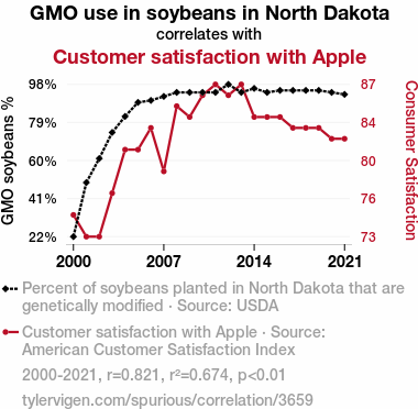 - The spurious research paper: The Soy-Apple Connection: Genetically Modified Soybeans and Customer Satisfaction with Apple Products