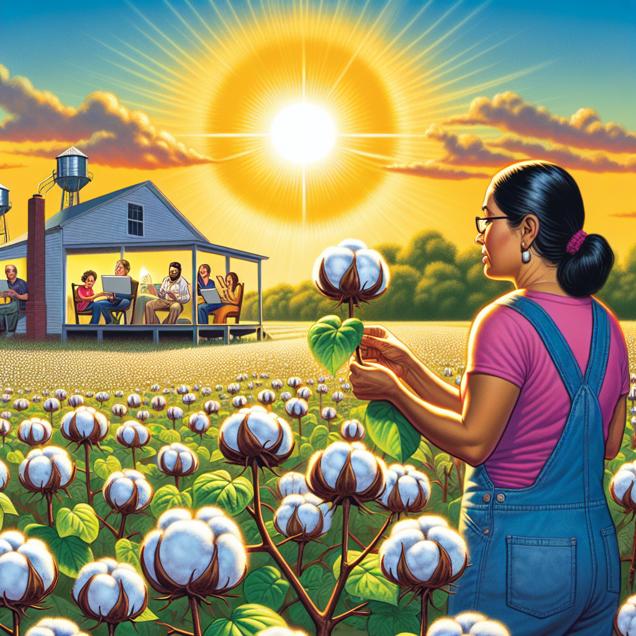 Prompt: Generate an image that illustrates the scene on a Discovery magazine cover, showcasing a sun-drenched Alabama field. Within the field, rows of genetically modified cotton plants stretch into the distance. A farmer in denim overalls examines the healthy, vibrant GMO cotton bolls, reflecting the success of biotechnology in agriculture. Meanwhile, in nearby homes, screens glow as people eagerly type 'xkcd' into their search engines, seeking out clever and nerdy webcomics. The unexpected connection between the GMO cotton and the surge in xkcd searches is realized as the farmer and internet users share an unexpected link through biotechnology and internet humor. Capture the juxtaposition of the rural landscape and the digital world in a simple yet compelling manner for the cover of Discovery magazine. The depiction should include only scenes, people, and objects, it should not include text or speech bubbles.