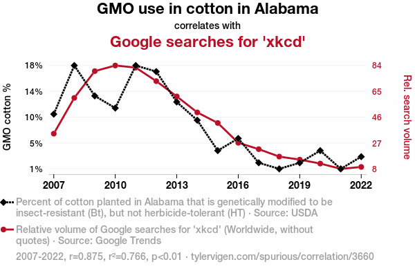 A linear line chart with years as the X-axis and two variables on the Y-axis. The first variable is GMO use in cotton in Alabama and the second variable is Google searches for 'xkcd'.  The chart goes from 2007 to 2022, and the two variables track closely in value over that time. Small Image