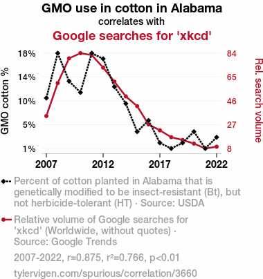 GMO, genetically modified organisms, cotton cultivation, Alabama, Google searches, webcomic, xkcd, USDA, Google Trends, correlation coefficient, p-value, biotechnology, farming, online whimsy