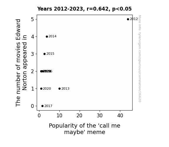 This means 41.2% of the change in the one variable (i.e., Popularity of the 'call me maybe' meme) is predictable based on the change in the other (i.e., The number of movies Edward Norton appeared in) over the 12 years from 2012 through 2023.