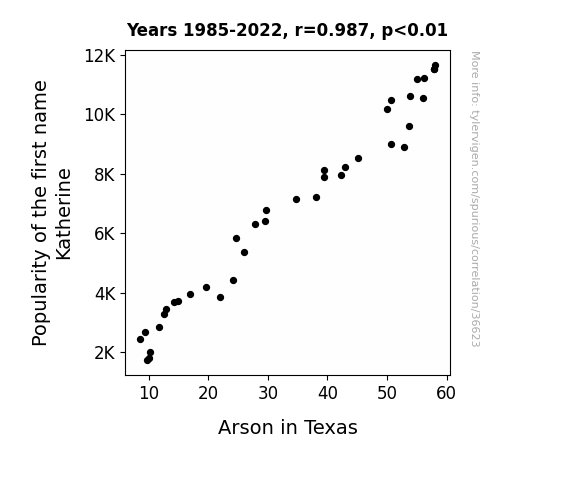 This means 97.5% of the change in the one variable (i.e., Arson in Texas) is predictable based on the change in the other (i.e., Popularity of the first name Katherine) over the 38 years from 1985 through 2022.
