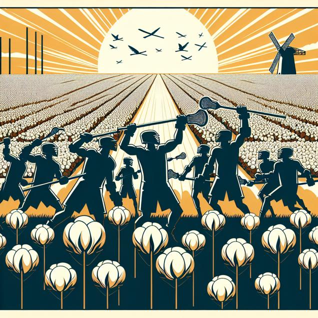User prompt: Please describe a visual scene that prominently depicts both GMO use in cotton in Georgia and National Lacrosse Champions' Final Point, in the following situation: The increased elasticity of genetically modified cotton fibers enabled players to make more precise lacrosse sticks, leading to unparalleled accuracy in their final shots.. Keep the description simple.