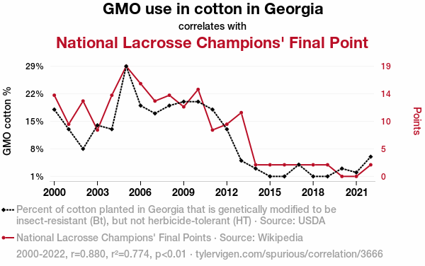 User prompt: Please provide potential search keywords for a paper titled Cotton GMO-nomics: A Fiber-Tastic Connection to Lacrosse Glory with an abstract of In this study, we explore the intriguing relationship between the use of genetically modified organisms (GMOs) in cotton cultivation in the state of Georgia and the final points scored by the National Lacrosse Champions. Utilizing data from the USDA and Wikipedia, our research team embarked on a quest to unravel this seemingly absurd correlation. Our findings revealed a remarkably high correlation coefficient of 0.8796942 with a p-value less than 0.01 for the period spanning from 2000 to 2022.