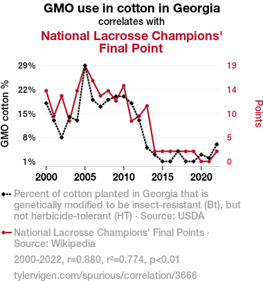 This means 77.4% of the change in the one variable (i.e., National Lacrosse Champions' Final Point) is predictable based on the change in the other (i.e., GMO use in cotton in Georgia) over the 23 years from 2000 through 2022.