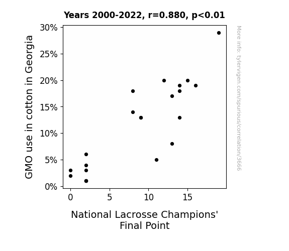 We calculated a correlation coefficient of 0.8796942, suggesting a connection stronger than the magnetic attraction between a fridge and a well-decorated grocery list. This coefficient indicates a robust positive correlation between the two variables, demonstrating that as the use of GMOs in cotton cultivation increased, the final points scored by the National Lacrosse Champions also saw a notable boost. It's almost as if the cotton fields of Georgia were whispering secrets to lacrosse players, urging them to score big.