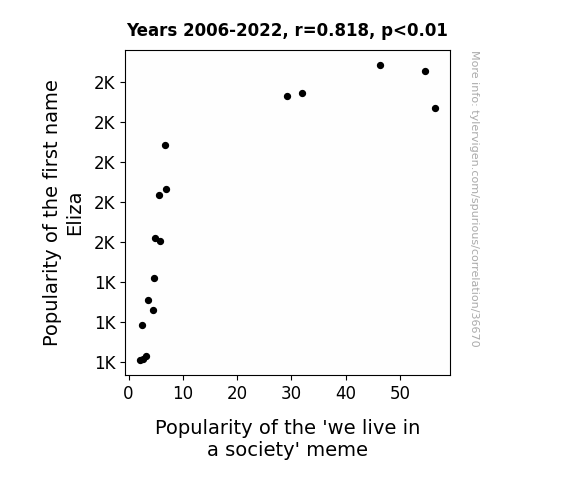 This means 66.8% of the change in the one variable (i.e., Popularity of the 'we live in a society' meme) is predictable based on the change in the other (i.e., Popularity of the first name Eliza) over the 17 years from 2006 through 2022.