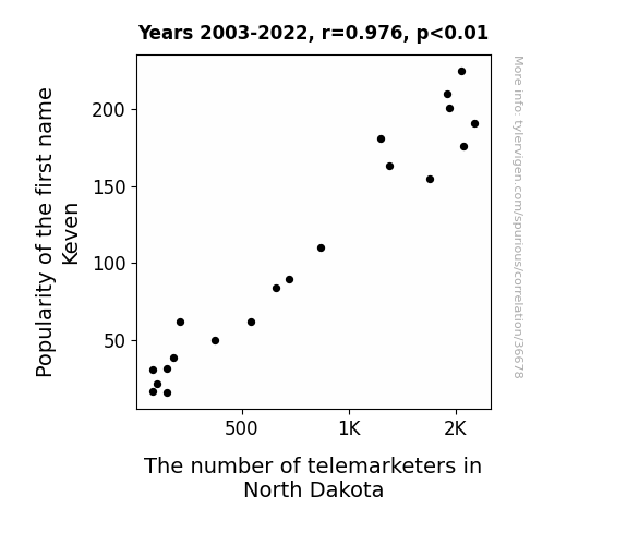 This means 95.2% of the change in the one variable (i.e., The number of telemarketers in North Dakota) is predictable based on the change in the other (i.e., Popularity of the first name Keven) over the 20 years from 2003 through 2022.